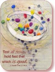 Seen in this light, ‘‘Test all things; hold fast that which is good.’can mean asking God's will again and again, allowing ourselves to be moulded and guided by it. It is usually not as simple as in the diagram, where gemstones stand out clearly from the others. Paul mentions some behaviours that correspond to God's will and serve the good. The coloured gemstones can mean different things. Some: Do not repay in kind if you think that someone is trying to harm you. Dare to take the first step out of the destructive vicious circle. Others: Bless those who put obstacles in your way and grant them good things. Still others: Radiate joy and confidence where courage and hope are sinking. Being a Christian does not mean painting and seeing everything in black. Then there are those for prayer: There is nothing that you cannot bring before God. At any time, day or night. And finally: realise that you are the recipients of gifts and that you are not neglected.